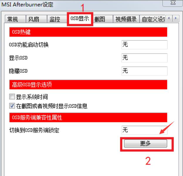 4、afterburne在使用时,还可以在“OSD显示”的向导页中,点击界面中的“更多”进行相关设置。