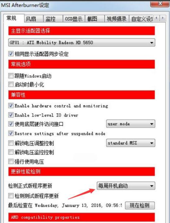 2、在afterburne使用中,可以在“常规”的向导页,对显卡、性能检测等等进行相关设置。