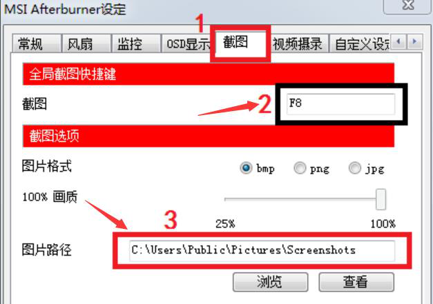5、此外,在afterburne使用中,用户也可以对它截图功能的电脑快捷键和输出路径进行设置,如下图,这里,设置游戏截图的快捷键是F8。