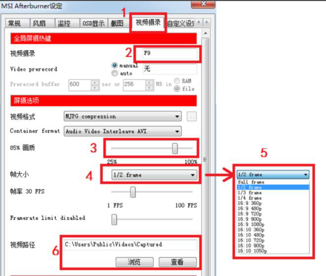 6、有些用户,喜欢在游戏的时候,对自己的游戏进行录制。就可以使用afterburne的“视频摄录”来实现。用户需要设置视频摄录的快捷键、画质、录制的速度、输出的路径。