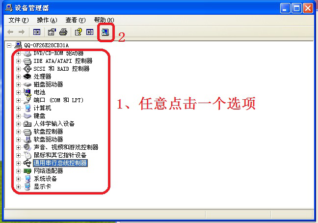 5、将所有USB相关驱动依次卸载完毕后,点击图中任意一个选项,然后点击选择图中标注为“2”的按键(即扫描检测硬件改动按键)。这样系统就会自动扫描并重新安装被卸载的驱动。