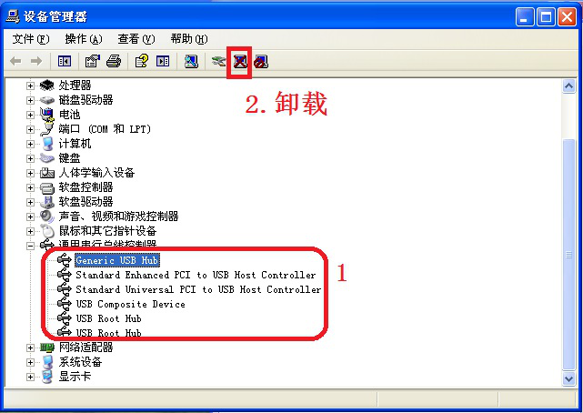 4、点击“通用串行总线程控制器”左面的【+】,显示下拉菜单。依次点选所有USB驱动,然后点击如图标注的卸载图标,将所有USB相关驱动依次卸载。
