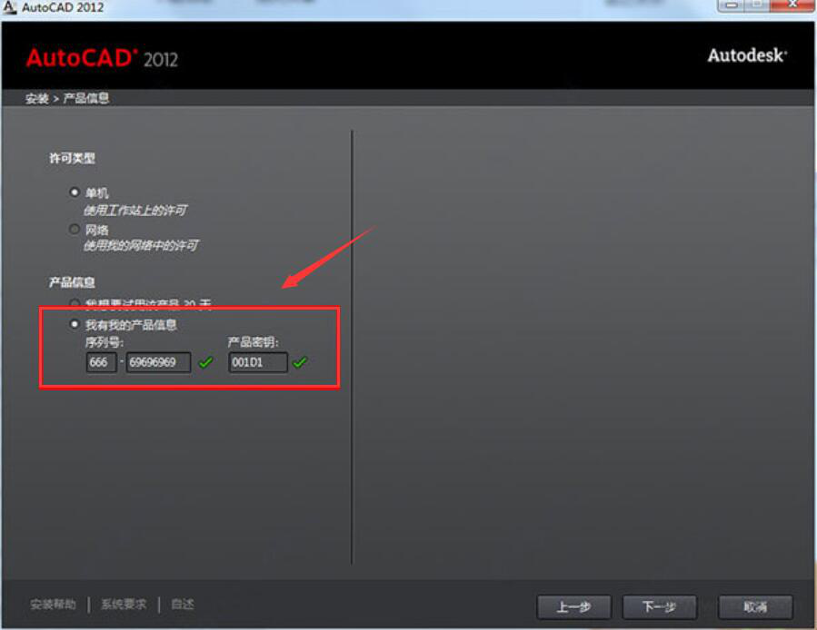 2、然后,进入到cad2012的产品信息界面。在产品信息处勾选“我有我的产品信息”,并输入序列号和产品密钥。