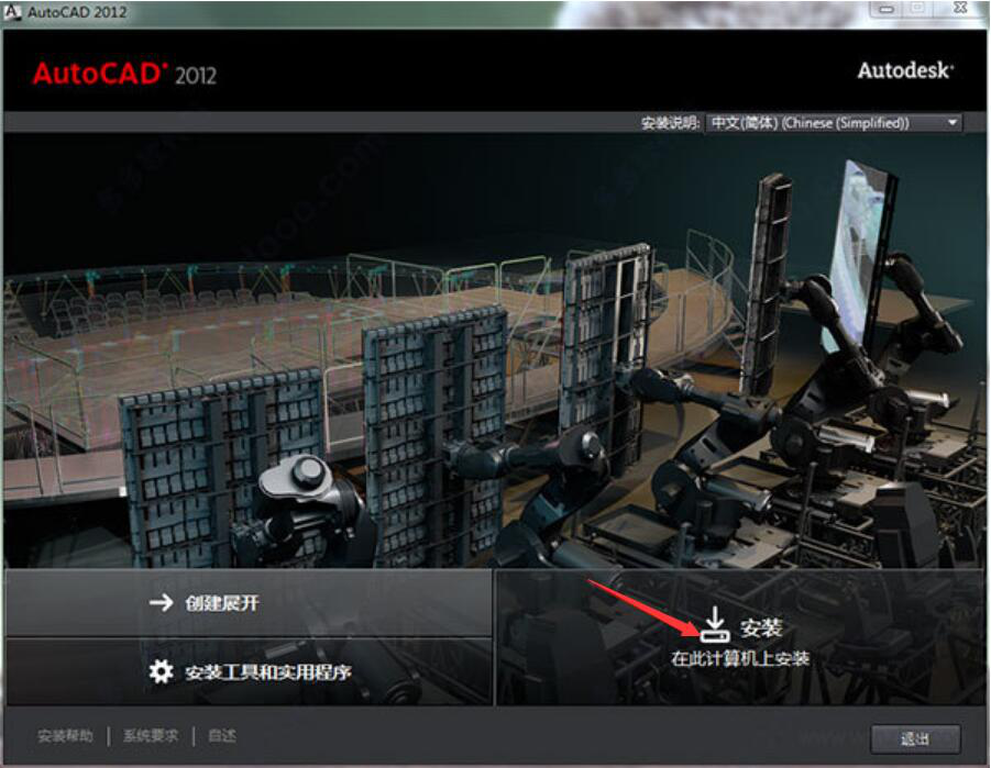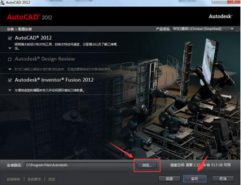 3、接下来,点击“浏览”设置安装的路径,并点击“安装”。要注意cad2012注册机要和安装文件的路径一致。因为,路径不一致也是cad2012注册机激活不了的常见原因之一。