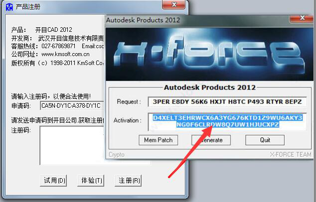 6、用户依次点击“Mem path”、“Generate”,cad2012注册机便会自动生产出一组用户注册时候需要用到的注册码,用户将注册码复制到“Activation”即可。