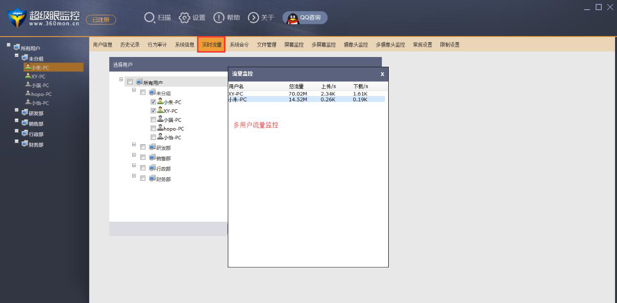 实时流量。很多企业都会设立IT部门。而工作中,有些员工会利用公司的网络下载与工作无关的大文件,从而拉低了整体的网络速度。超级眼管理端便可以通过这个功能来看具体是哪位员工,从而更好维护网络。