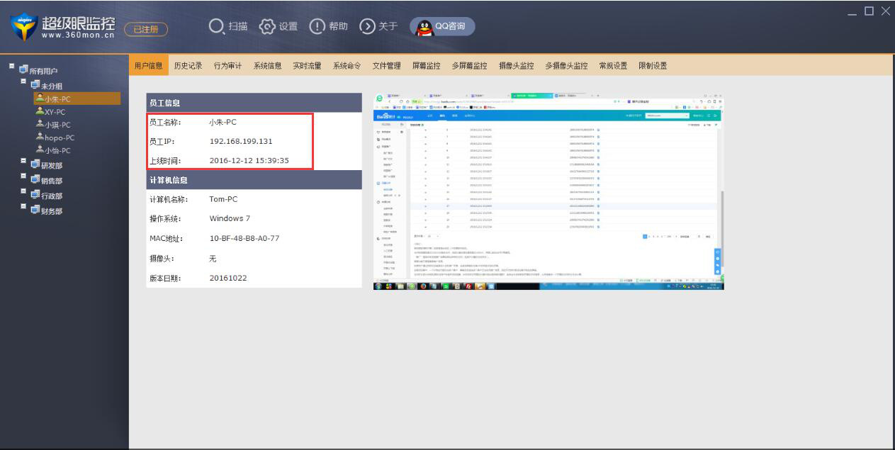 它可以查看员工端任何一位在线员工的信息,比如上线时间。因为很多企业都是打卡上班,而员工有时候会忘记打卡,所以人事部就可以以此为考勤的依据。
