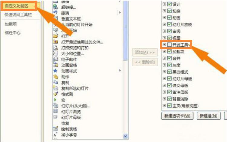 3、然后,点击选项界面中的“自定义功能区”,并在相关列表中勾选“开发工具”。要注意,安装ppt动画大师,这一项是必须要勾选的。
