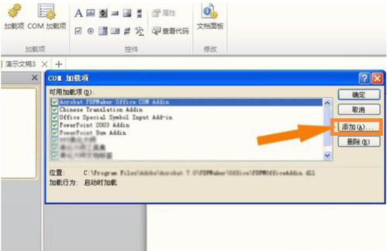5、在弹出来的“COM加载项”窗口中,点击“添加”按钮,将ppt动画大师插件加载进PowerPoint,从而进入ppt动画大师安装的下一步操作。