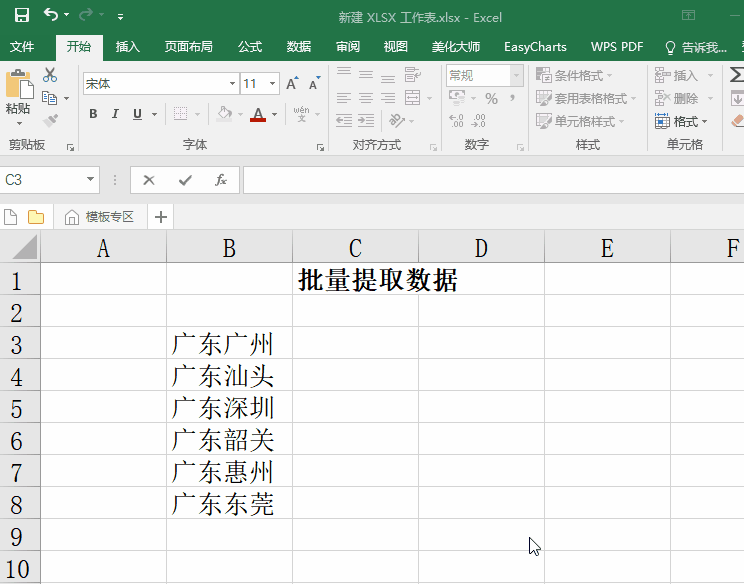 操作:如图,需要提取“广东”后的数据,先在C3单元格中输入“广州”,然后点按快捷键【Ctrl+E】,就能快速提取指定数据。