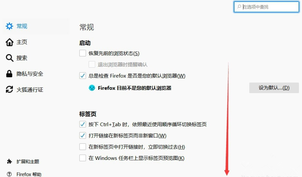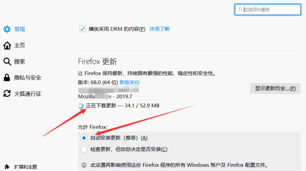 进入新的窗口,默认显示Firefox常规设置,下拉页面,如图,这里默认勾选【自动安装更新】,一旦火狐浏览器出现新版本就会自动更新,