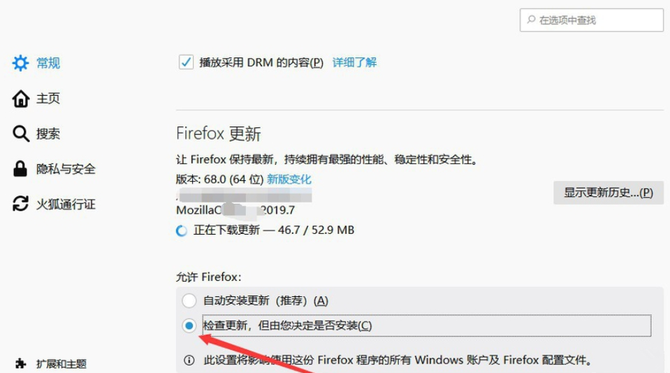 现在进行修改,勾选【检查更新,但由您决定是否安装】,即可关闭Firefox的自动更新功能,