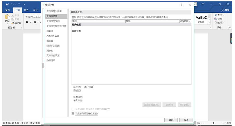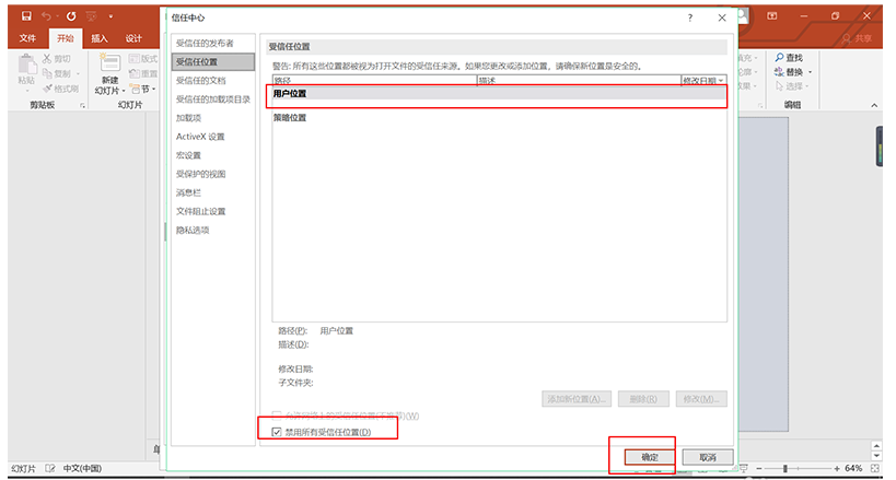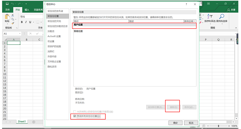 点击右下角的【删除】,删除这6个受信任位置,然后勾选【禁用所有受信任位置】选项,点击确定即可。