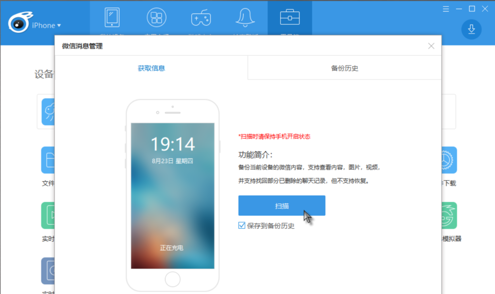 点击【微信管理】,弹出面板,如图,点击【扫描】,软件即会扫描iPhone手机,获取数据信息,