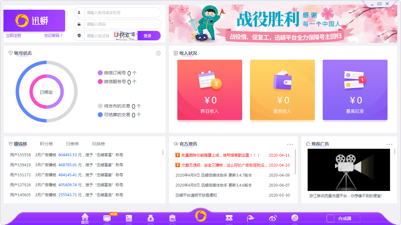 迅蟒自媒体助手是一款专业的自媒体营销助手软件。该软件自带素材编辑器、热点风向标和多媒体素材库,能够有效辅助自媒体编辑人员迅速收罗编辑出热点文案视频。除此之外,迅蟒自媒体助手还支持多账号登录管理,并为自媒体用户提供营销变现平台。