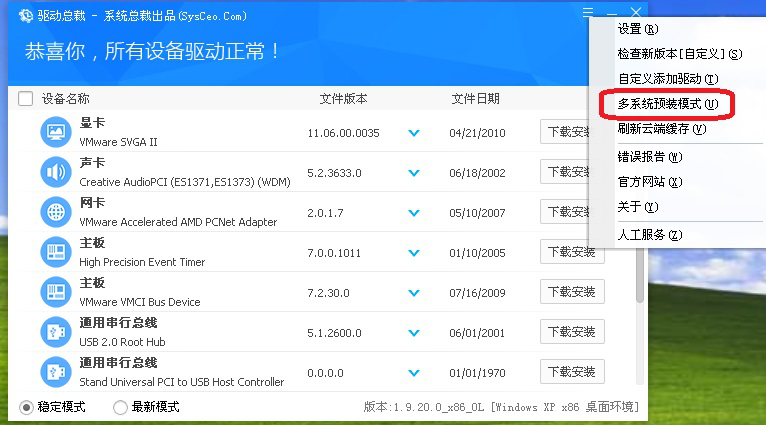 11、点击驱动总裁软件右上方“三”字图标,在其下拉菜单中选择点击【多系统预装模式】。