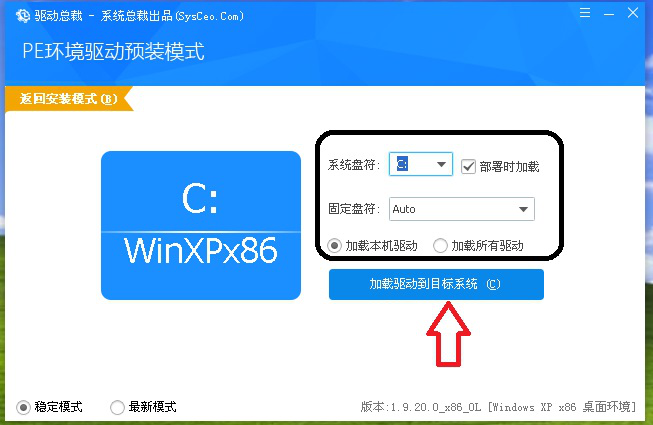12、进入PE环境驱动预装模式。点击系统盘符后△图标选择不同的系统模式,点击固定盘符后的△图标选择驱动要加载的目标盘符(一般选择AUTO),然后点击【加载驱动到目标系统】。这样就实现了多个系统模式的驱动预装。