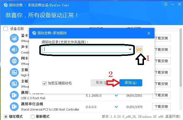 10、点击打开文件夹图标,选择用户自备的驱动文件(或者直接把自备的驱动文件拖拽到图中方框内),然后点击【添加】,即可把自备驱动添加到驱动列表中进行安装。