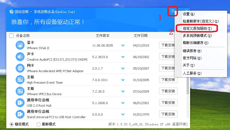 9、点击驱动总裁软件右上方“三”字图标,在其下拉菜单中选择点击【自定义添加驱动】。