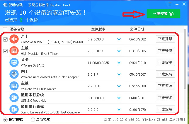 6、对于普通用户,这里默认软件推荐(即图中红色图标驱动),当然用户也可以根据自身需要选择驱动安装或更新。在选择好希望安装的驱动后,点击界面右上方【一键安装】。