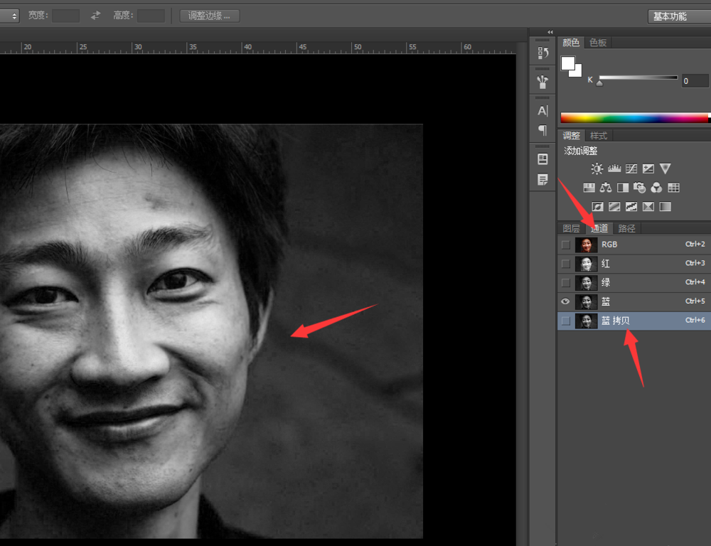 打开Photoshop软件,导入一张准备好的图片,复制背景图层,然后点击【通道】,将蓝色通道进行拷贝,如图,