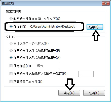 7、在输出选项窗口,点击【浏览】选择拆分文件保存位置,然后点击【确定】。