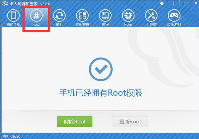 3、当卓大师刷机专家成功识别手机后,用户需要点击“Root”获取root权限。