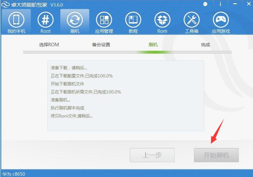 6、此时,卓大师刷机专家会进入“刷机”的界面,用户点击“开始刷机”的按钮,卓大师刷机专家便开始执行刷机的指令。此过程大概需要耗时5分钟。