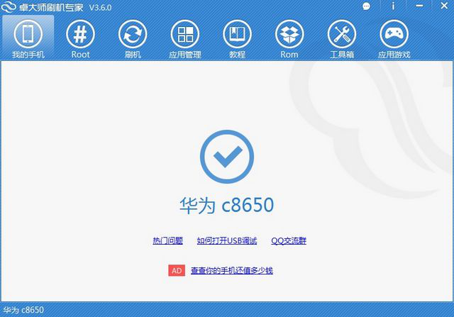 2、然后,将需要刷机的手机连接到电脑,并调至USB模式。此时,卓大师刷机专家会自动识别用户的手机。