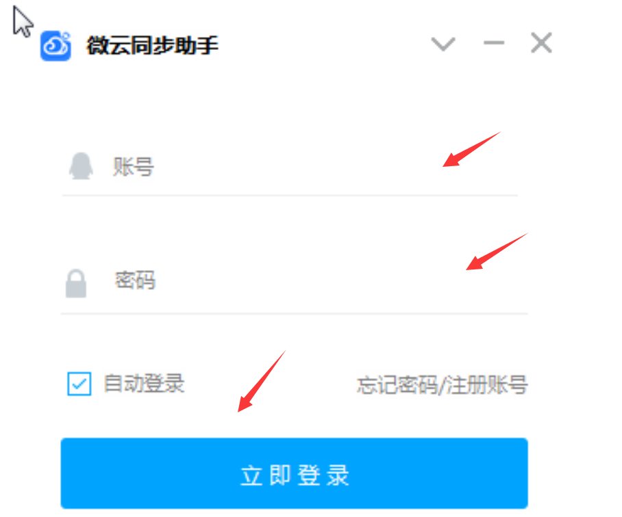 2、然后,在腾讯微云同步助手的登录界面,输入注册时的账号、密码,点击“立即登录”按钮,从而进入腾讯微云同步助手的操作界面。
