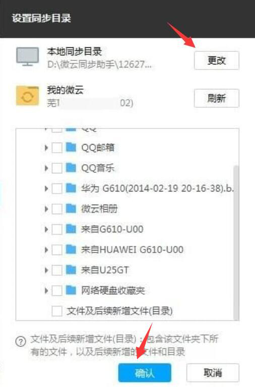 5、在弹出来的“设置同步目录”窗口中,点击“更改”,设置需要腾讯微云同步助手同步的文件资料所在的路径,之后,点击下方的“确定”按钮。
