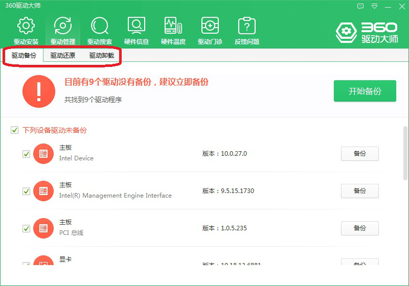4、【驱动管理】。可以看到该选项下有“驱动备份”、“驱动还原”、“驱动卸载”三个小选项:驱动备份与还原配合使用,防止因驱动升级或其他意外导致驱动不可用;驱动卸载即卸载指定驱动程序。
