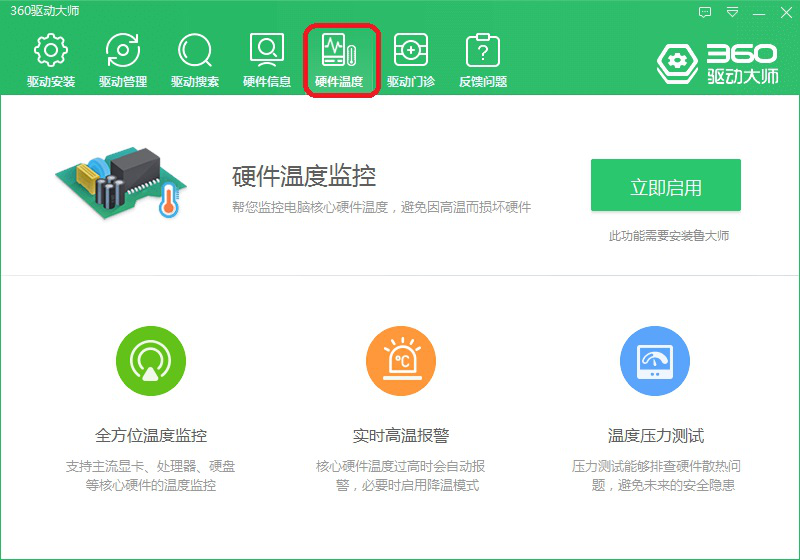 7、【硬件信息】。点击此界面中【立即启用】,可以对显卡、处理器、硬盘等重要硬件进行实时温度监控、高温报警和温度压力测试,更好的帮助用户保护电脑安全。