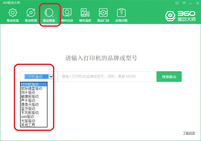 5、【驱动搜索】。在这个界面,用户可根据需要搜索打印机驱动、鼠标键盘驱动、网卡驱动等各类驱动。