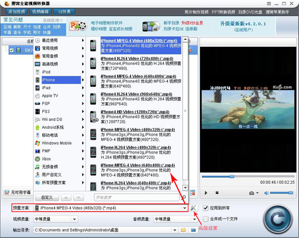 如图,点击【预置方案】后面的按钮,选择视频输出格式,狸窝全能视频转换器支持根据播放设备来选择格式,非常方便,