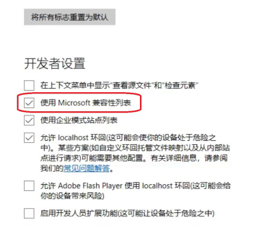 4、打开Microsoft Edge浏览器“开发者设置”,在“使用microsoft兼容性列表”前的□内点【√】。这样就更改了Microsoft Edge浏览器的兼容性设置。