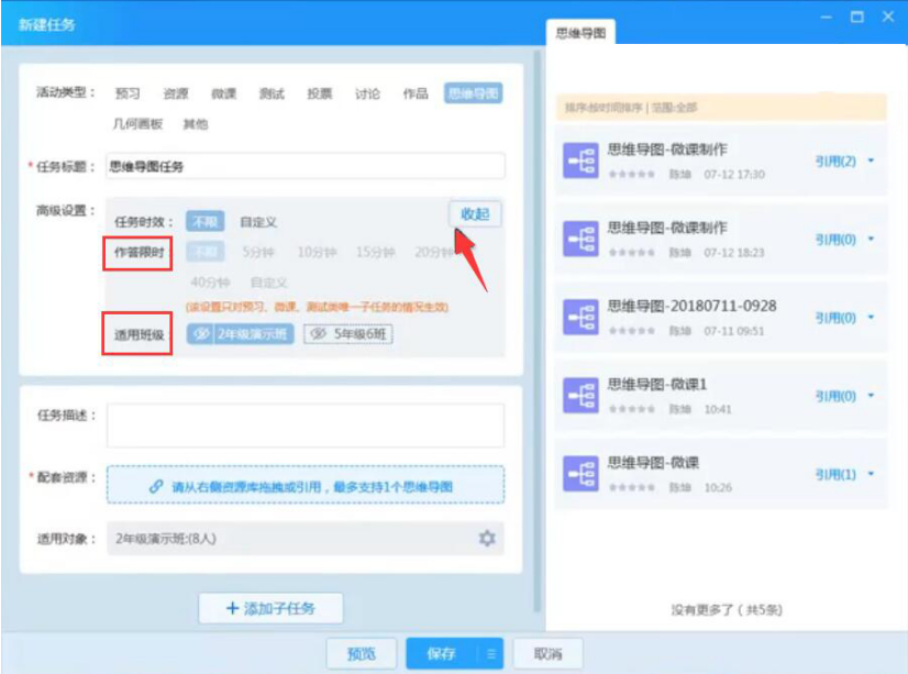 9、在AiClass思维导图的设置栏,用户可以设置学生作答的时间和适用的班级。设置完成,点击“收起”按钮。