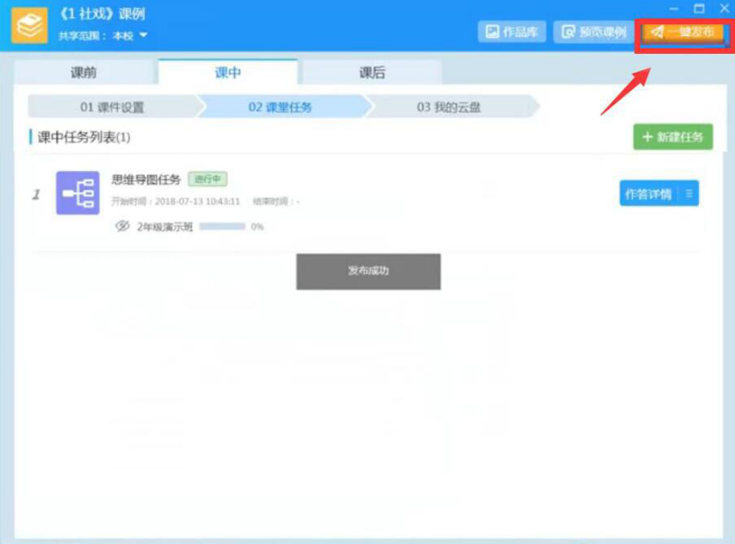 11、接下来,点击AiClass右上方的“一键发布”按钮,AiClass思维导图便可推送到学生端的平板。
