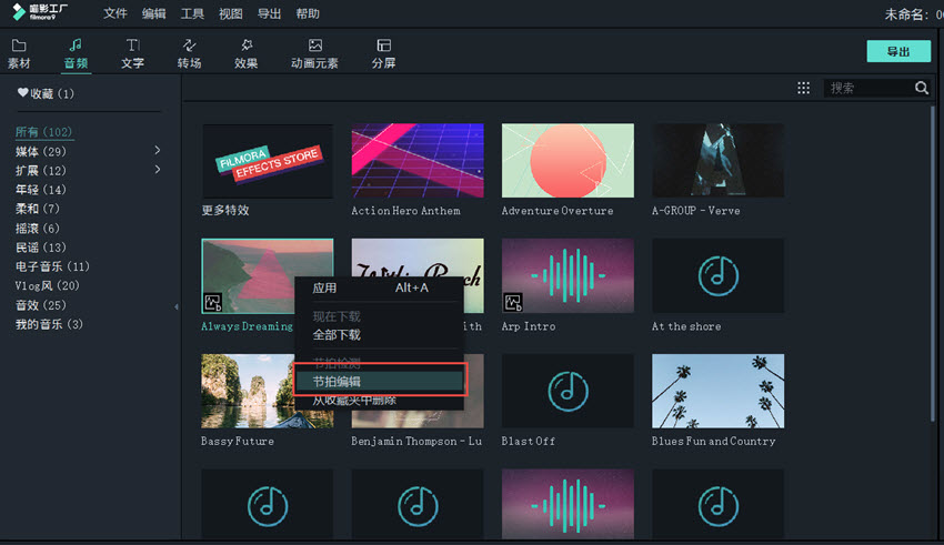 如图,点击【音频】,鼠标右击媒体库中的音乐素材,选择【节拍检测】,喵影工厂将会自动分析、检测音乐节奏,