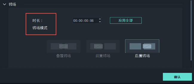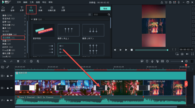 点击【转场】,在两个照片之间加上一个具有视觉冲击力的转场效果,如扭曲分类和运动模糊分类,可以让音乐相册更酷炫;如果节奏较快,将转场时长调短,效果会更好,