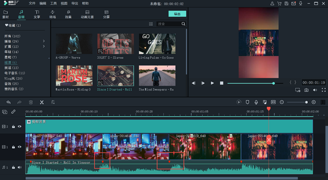 现在将音频导入音乐轨道,你可以看到音频上标记了许多节奏点,在预览框播放试听,如果发现不准确的标记,可以移动调整,