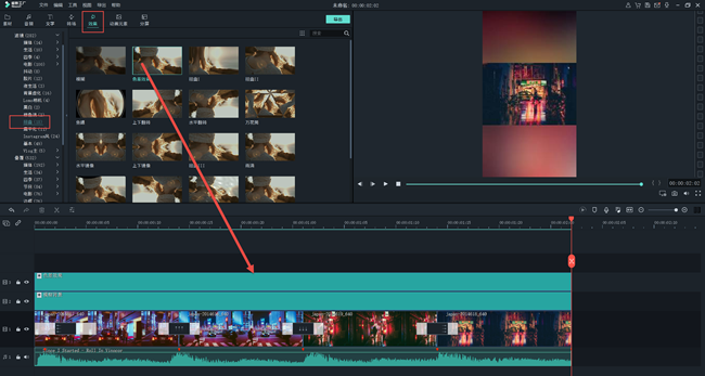 点击【效果】,在照片上加入一些不同滤镜效果,可以让视频更加动感炫酷,