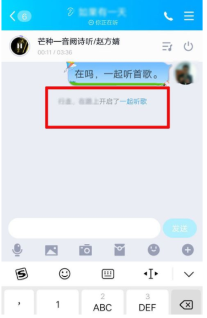 回到聊天窗口,这里会有提示,已经开启【一起听歌】功能,只要对方点击提示,你们俩就可以听一样的歌曲了,