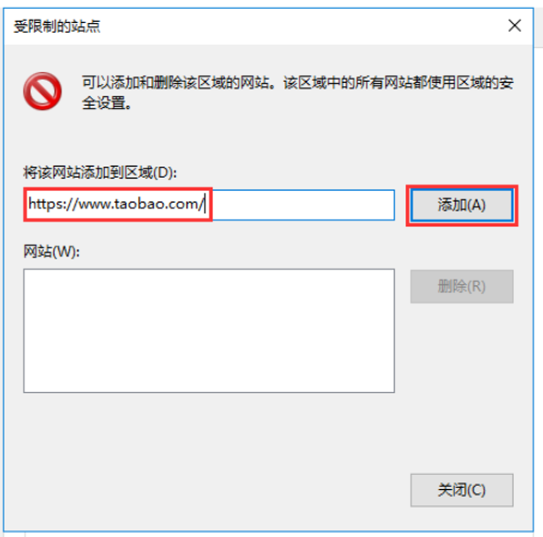 弹出窗口,如图,点击【将该网站添加到区域】,输入淘宝的网址,点击【添加】,