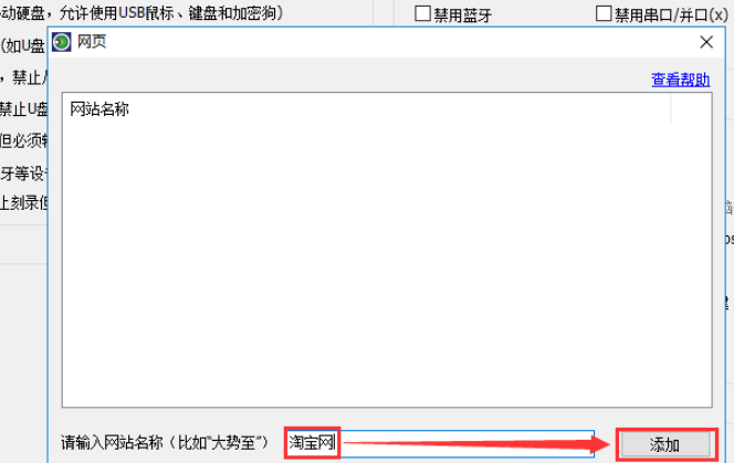 出现弹窗,如图,点击【请输入网站名称】,输入淘宝网,然后依次点击【添加】、【保存】,