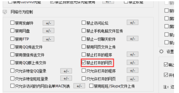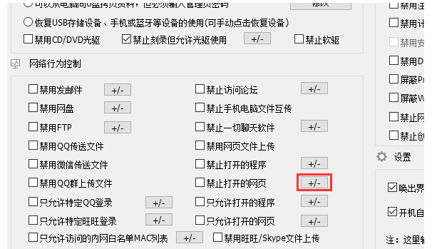 成功登录大势至电脑文件防泄密系统,进入软件界面,如图,在左侧菜单中找到【网络行为控制】,点击【禁止打开的网页】后面的+/-按钮,