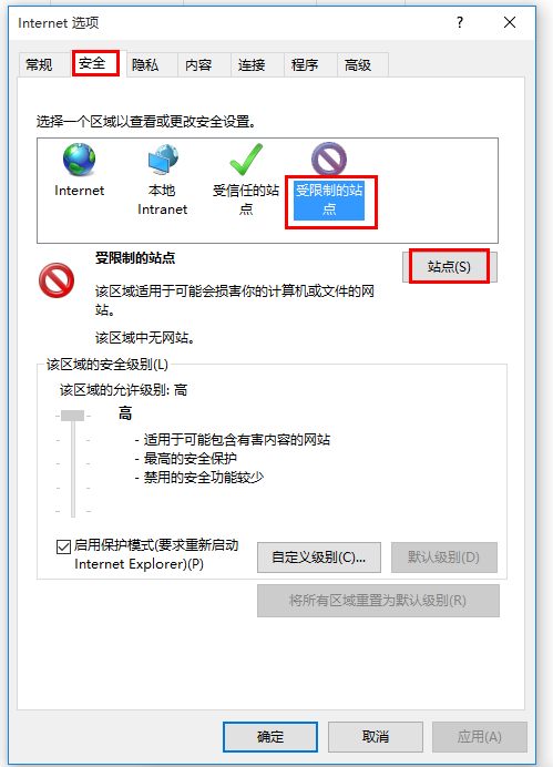 打开Internet选项面板,如图,切换【安全】标签,点击【受限制的站点】——【站点】,