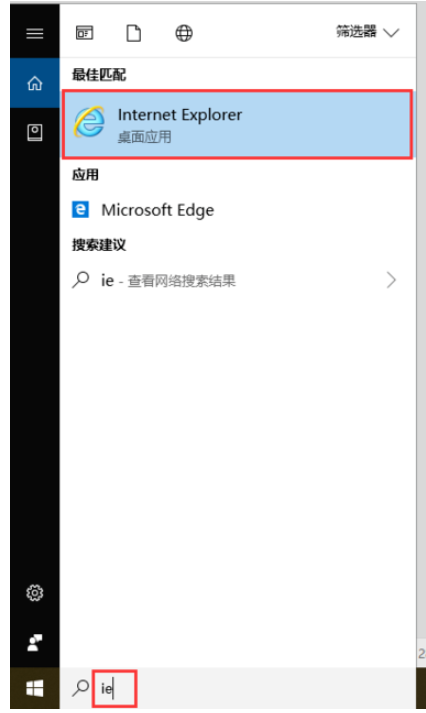 本教程就以Win10系统为例,点击任务栏左下角的搜索框,输入IE,弹出菜单,点击Internet Explorer,