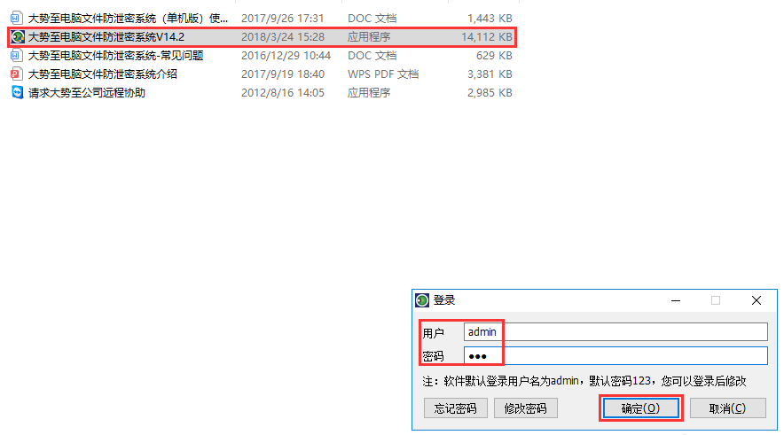下载大势至电脑文件防泄密系统,根据提示进行安装,安装完成,点按快捷键【alt+F5】,唤出登录框,输入账号密码,