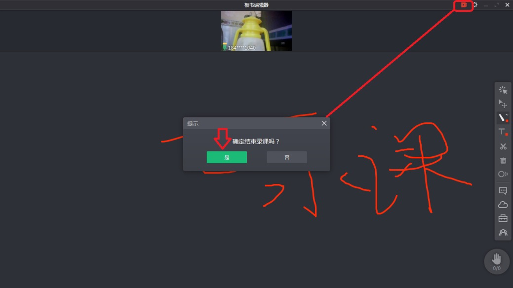 6、课程结束后,点击右上方录制图标,然后会弹出“提示”对话框,选择【是】结束视频录制。